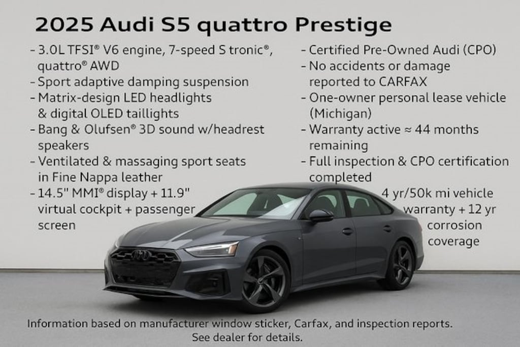 This 2025 Audi S5 Sportback Prestige quattro, finished in Magnet Gray with a striking Arras Red Fine Nappa leather interior, perfectly balances athletic design with luxurious refinement. With only 1,472 miles, this CARFAX One-Owner vehicle shows as-new condition and is now Audi Certified Pre-Owned (CPO) for enhanced coverage and long-term peace of mind. Combining cutting-edge technology, precision engineering, and bold styling, this S5 represents the best of Audis performance lineage.